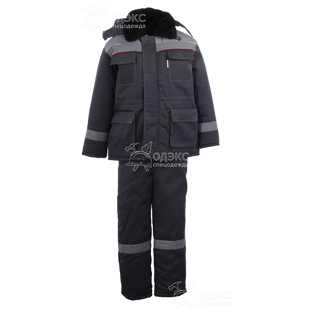 Костюм Макс утепленный повышенной комфортности для руководящего состава. Куртка с супатной застежкой на молнии, воротник отделан флисом, отстегивающийся регулируемый капюшон, рукава с трикотажными напульсниками. На куртке кулиса в области талии, боковые карманы объемные с клапаном, нагрудные накладные карманы с клапанами. Брюки с высоким утепленным поясом, регулируемыми бретелями с фастексами. Цвет: темно-серый со светло-серой кокеткой + красная отделка. Ткань: 35% хлопок, 65% полиэфир, плотность 240 г/м2. Утеплитель: синтепон в куртке 360 г/м2, в брюках - 240 г/м2. Подкладка: 100% полиэстер. Размеры: с 44-46 по 60-62. Рост: 170-176, 182-188.